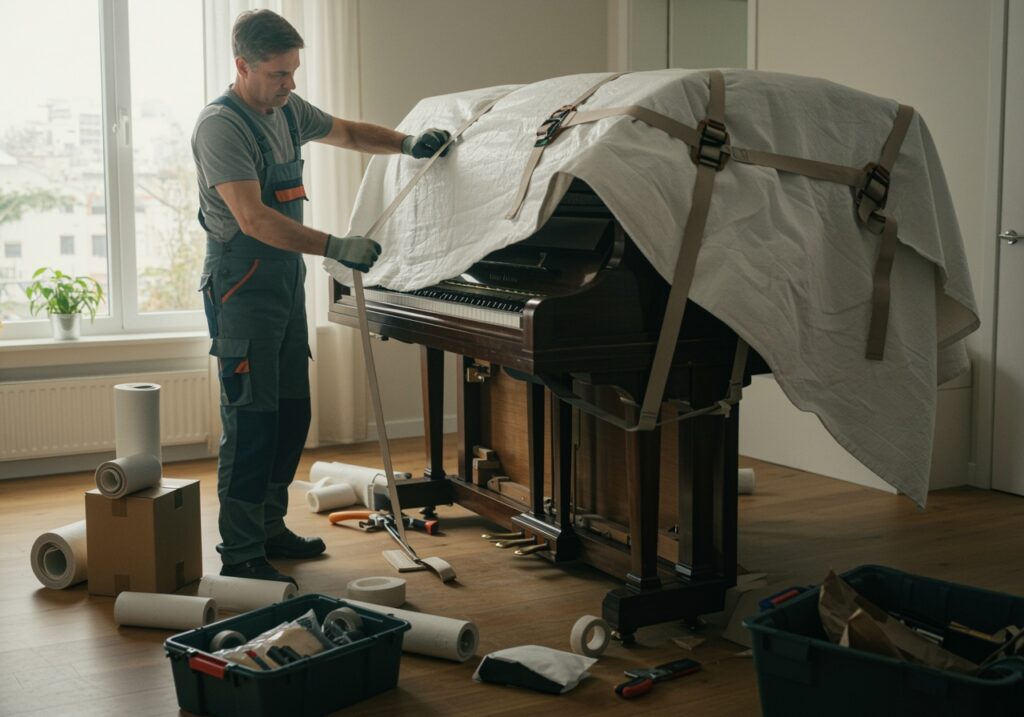 För att skydda instrumentet och bostaden rekommenderar vi också att ni plastar in pianot med sträckfilm för att hålla luckor och tangenter på plats, och därefter täcka pianot med tjocka flyttfiltar. Särskilt utsatta hörn bör skyddas med kartong eller skumplast. Golven skyddas bäst med masonitskivor där rullplattan ska framföras, då punktbelastningen från hjulen kan ge bestående märken i parkett. I trappor är filtar och halkskydd helt avgörande.